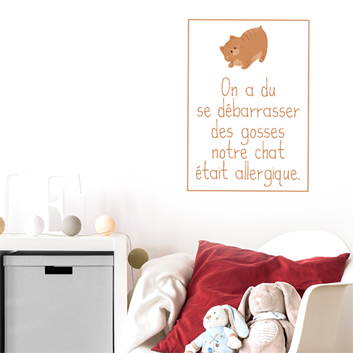 Fan d'humour un tantinet borderline ? Les citations à l'eau de rose ce n'est pas votre fort ? Vous vous demandez toujours si vous préférez votre chat à votre enfant ? Mettez donc cette citation sous forme de sticker en avant sur l'un des murs de votre habitation ... Elle risque de faire un ravage ! Malgré un humour très poussé, ce sticker attendrira les caractères les plus durs de ceux qui passeront devant avec son petit chat à la mou respirant la tendresse. Réflechissez déjà à l'endroit où prendra place cet autocollant car c'est un accessoire de décoration dont on ne peut se passer !