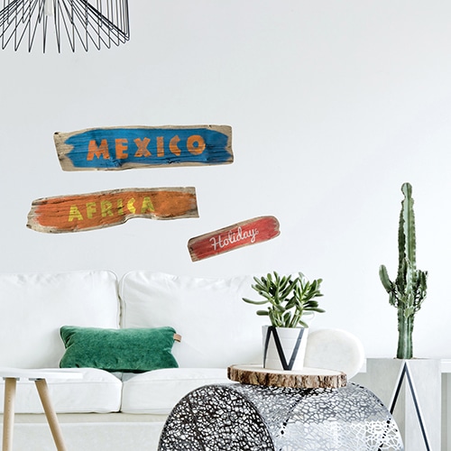 Vous rêvez de partir en vacances sans bouger de votre canapé ? C’est désormais possible grâce à notre pack de stickers autocollants muraux Vacances Tribales, dès maintenant et uniquement chez Wall Sweet Home ! Ce pack de stickers adhésifs muraux représente des panneaux indiquant des destinations exotiques. Grâce à ce pack de stickers adhésifs muraux, vous pourrez donner une ambiance exotique et très chaleureuse à votre intérieur en seulement quelques minutes ! De plus, vous vous croirez en vacances toute l'année ! Génial n’est-ce pas ? Dans ce pack, nous vous proposons un ensemble de 3 stickers adhésifs muraux qui vous permettront de refaire votre décoration intérieure du sol au plafond ! Alors, qu’attendez-vous ? Les produits que nous vous proposons sont Made In France, et sont gage d’une grande qualité. De plus, le prix des stickers et le prix de la livraison sont très abordables ! Enfin, les stickers sont très faciles à poser et en plus, si vous décidez de les enlever ou de les déplacer, ils ne laisseront aucune trace ! Alors, dépêchez-vous !
